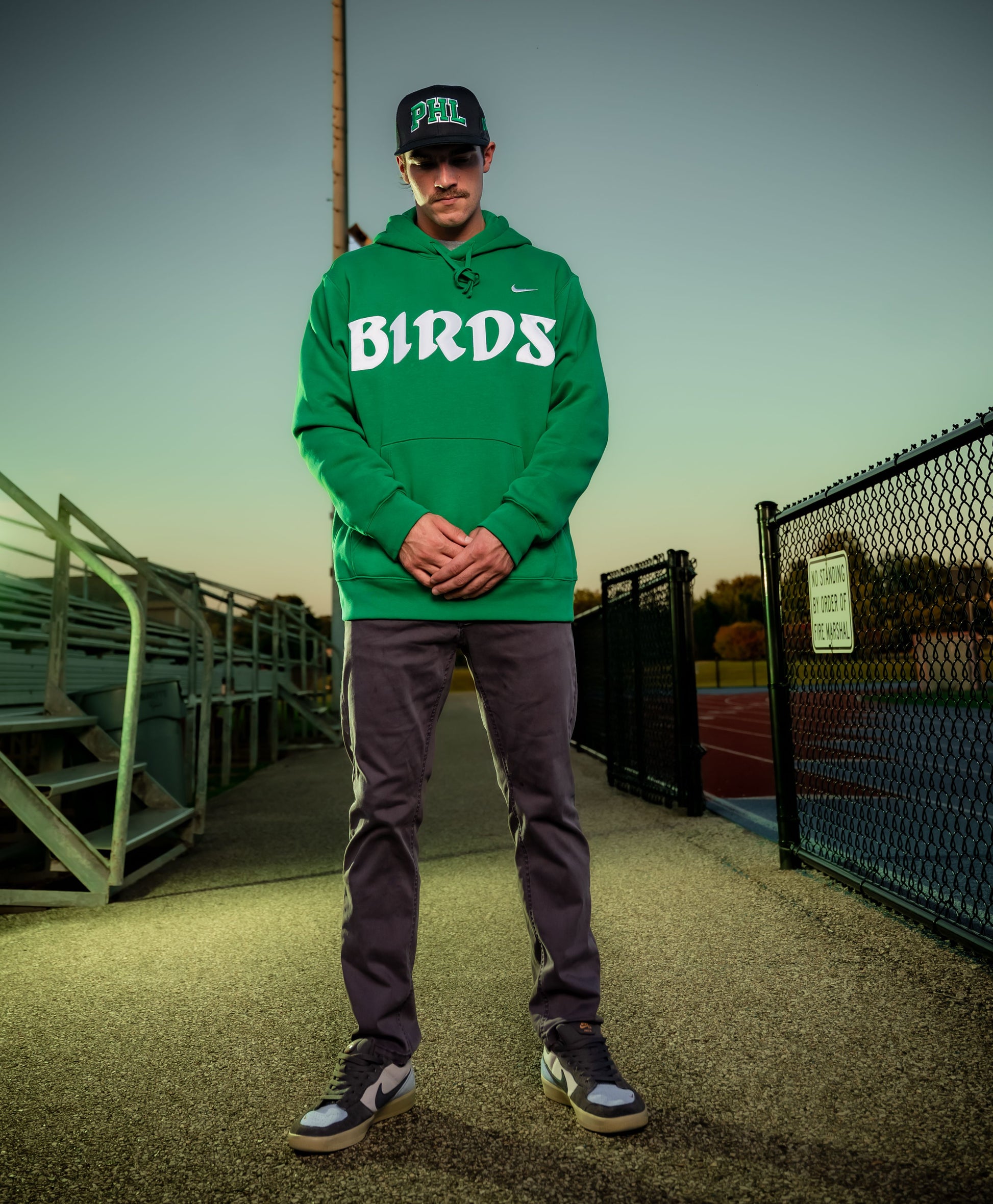 - PHL puff embroidery trucker hat. Black base with kelly green PHL puff.