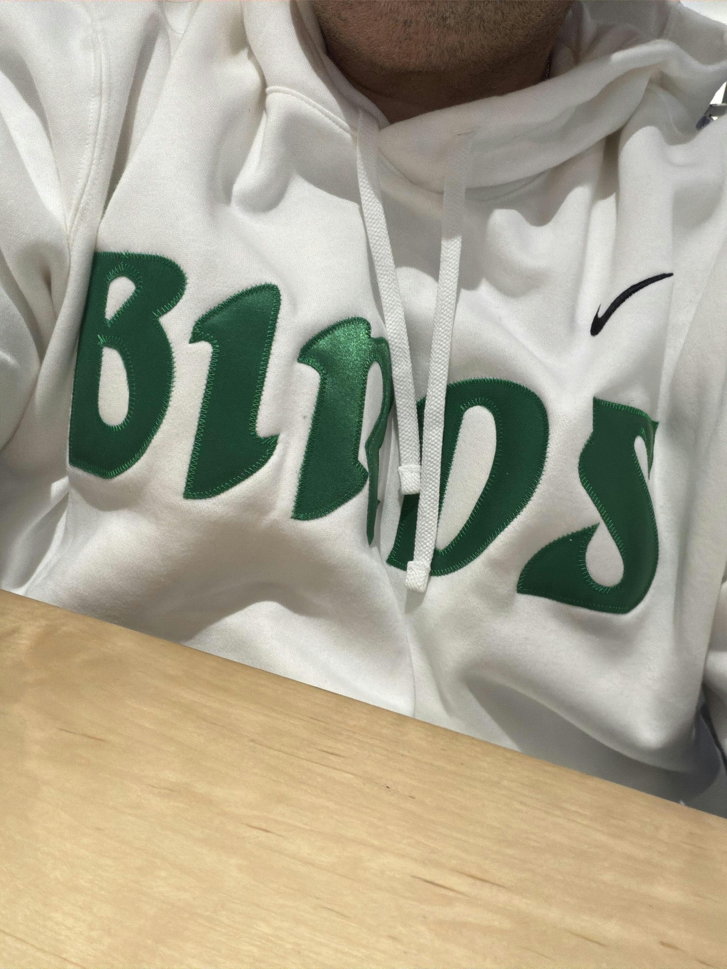 - Hand Stitched Vintage Birds Twill in Kelly Green. High quality Nike pullover hoodie.